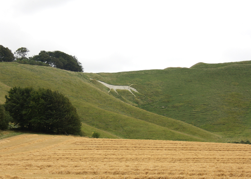 Those downs have their own, almost unique marks as well as the shaping of the earth in life and death. Something more dramatic and mysterious. At the point the ridge of the downs slopes down into broad, flat fields – the downs don’t peter out, they just end – is a white horse, carved in the chalk. (Well, once it was – these days the Westbury White Horse is laid in concrete and painted white).